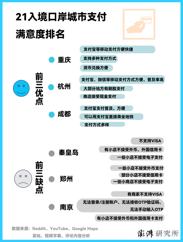 上海正建设中国入境游“第一站”,2024全年入境游客人次最多,但上海的支付满意度却意外未进入前三。在支付便利化方面,上海印发了《上海市进一步提升支付便利性行动方案》,全面推广“大额刷卡、小额扫码、现金兜底”支付模式,全市核心商圈、交通枢纽、三星级以上旅游饭店、3A级及以上旅游景区等大型场所,基本实现外卡POS机全覆盖。2024年5月上海推出一款多用途预付费卡“Shanghai Pass”,至2025年2月初,这款都市旅游卡已发售超过8.6万张、实现超过26万次交易。
