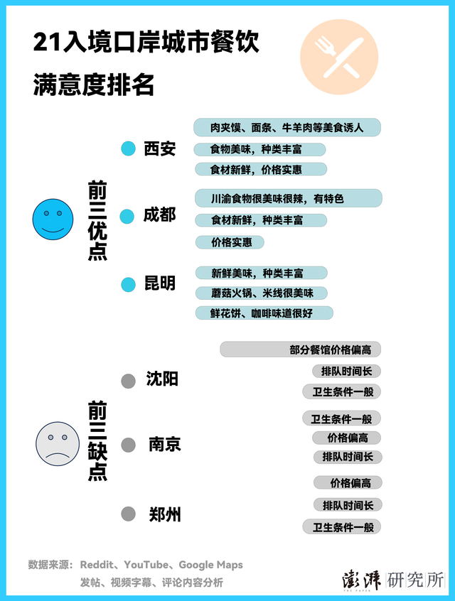 食材的丰富性、新鲜度、地方特色及价格实惠,是入境游客餐饮体验满意度的关键指标。因此,西安、成都、昆明这样的传统“美食之都”受到好评。而卫生条件差、餐厅排队时长、性价比不高等因素,则会影响游客体验,影响满意度。