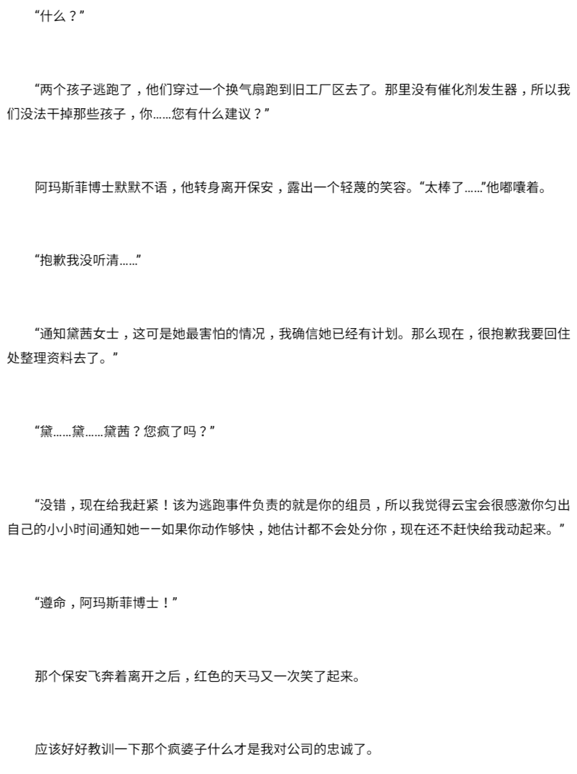 “我正说到这里。第三步就是确保所有的资源在进入工厂之前就可以立即无力化。尾烟是负责执行的马,也就是说,在工作小组的预算允许下,所有新的失败者都要装上‘保险开关’,如果需要的话可以马上对某个特定目标启动,确保在失败者装进天马设备之前不需要更多麻烦。”